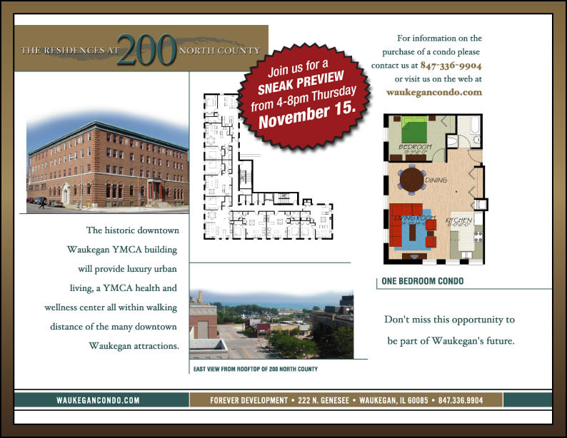 The historic downtown Waukegan YMCA building will provide luxury urban living, a YMCA health and wellness center within walking distance of the many downtown Waukegan attractions. 200 North County Brochure